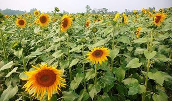 सुनसरीको इनरुवामा किसानले लगाएको सूर्यमुखी फुलको खेती । सूर्य जता फर्कीन्छ उतै फर्कीने स्वभाव भएको सूर्यमुखीको दाना तेलको लागि प्रयोग गरीन्छ । तस्विर: रासस