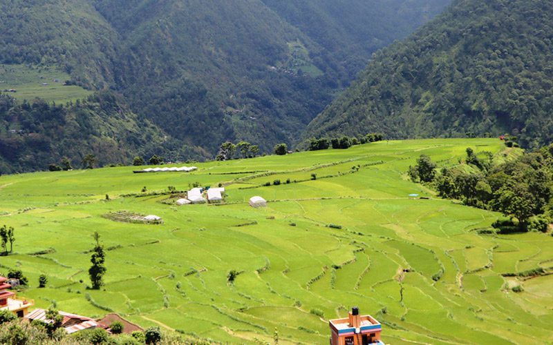 बागलुङ नगरपालिका–४ कुडुले फेदीमा रहेको हरियाली धान खेतको फाँट । यस खेतमा धानको राम्रो उत्पादन हुन्छ । तस्बिर : खेमराज गौतम/रासस